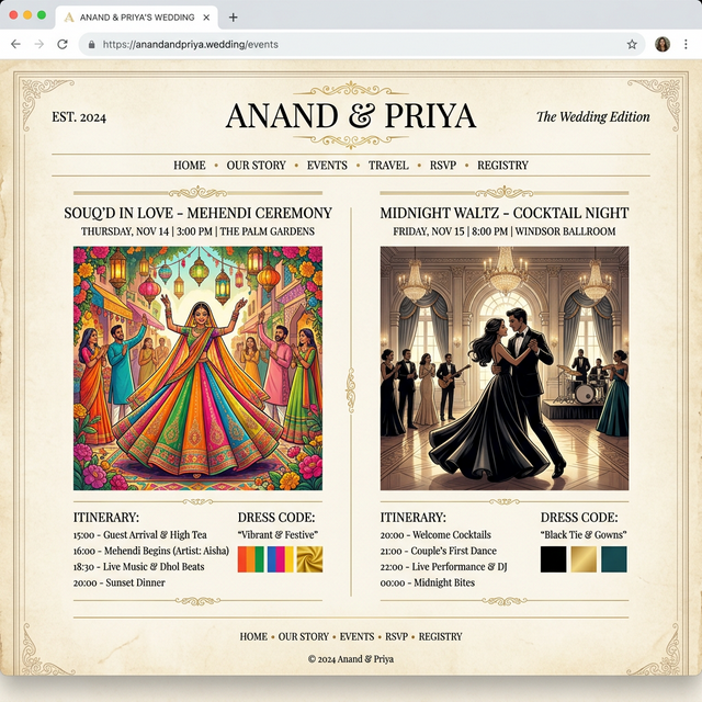 The couple wanted a wedding website that was far from ordinary — a digital keepsake as memorable as the celebration itself, built to host a destination wedding in Abu Dhabi across a multi-day itinerary.